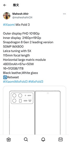 以下就是爆料小米mixfold3的外观设计图