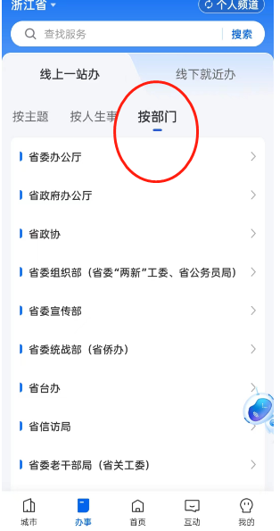 2、进入办事栏目页面后,点击如图所示的【按部门】