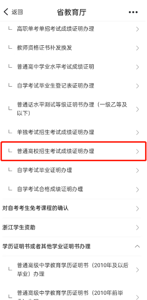 4、进入省教育厅栏目后,点击【普通高校招生考试成绩证明办理】进入,如图所示。