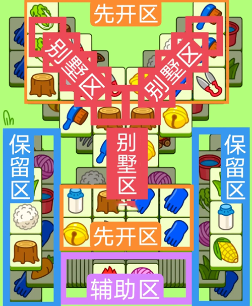 两个超大号斜着的长形别墅,一个竖着的长形别墅。开局先消除橙色区,然后按照一层层均匀消除表面牌不要跨层太多拿牌,必要时可以用盲盒区辅助消除表面牌。尽量还是以别墅区内互相消除为主,蓝色区基本都是明牌,全部保留到后期使用。